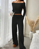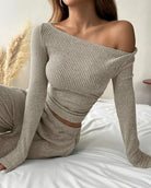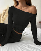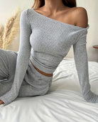 Stay stylish and comfy whether at home or out! This ribbed 2-piece loungewear set includes a slim-fit long sleeve top with an off-shoulder design and matching loose-fit pants – perfect for casual days, lounging, or light outings. 🌙☕